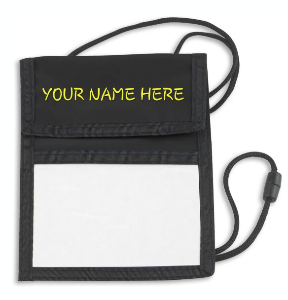 This name badge holder is great for any conferences or conventions that give out id badges that are a credit card or business card size. On the back, you can carry additional business cards and 2 pens. Under the flap there is 1 open pocket and a zippered pocket to keep your money and change safe. Customization is include at no additional cost. Please contact us for font, color and personalization options.